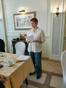 Po przerwie, przy kawie i słodkim poczęstunku, rozpoczęła się dalsza część zebrania. Prezes Koła Barbara Wieczorek przedstawiła porządek obrad dotyczący wyborów nowego Zarządu Koła Seniorów. Wybrano przewodniczącego zebrania, sekretarza oraz komisję mandatową. Następnie Pani Prezes przedstawiła sprawozdanie z działalności Koła za lata 2021–2025.